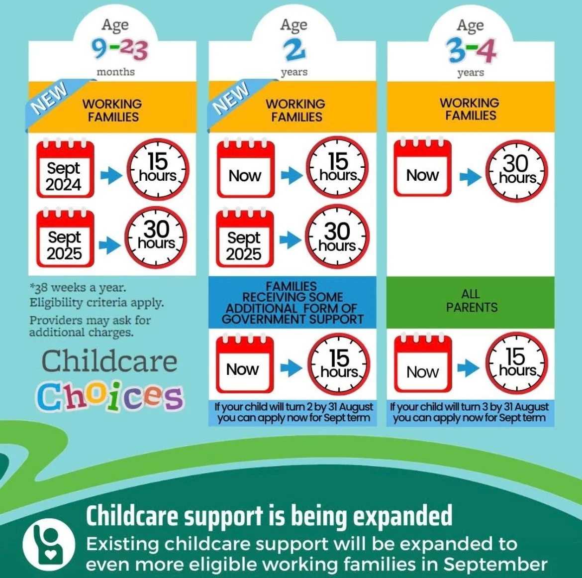 Other funding information can be found on the government’s Childcare Choices website – this includes details and links to apply for the extended entitlement for working families, help with costs if you are on Universal Credit and tax-free childcare. If you are looking at applying for 2-year-old funding the government has issued a FAQ sheet which has answers to a lot of your questions and also links to apply. The main details of the funding available (and if relevant, from when) are shown below: